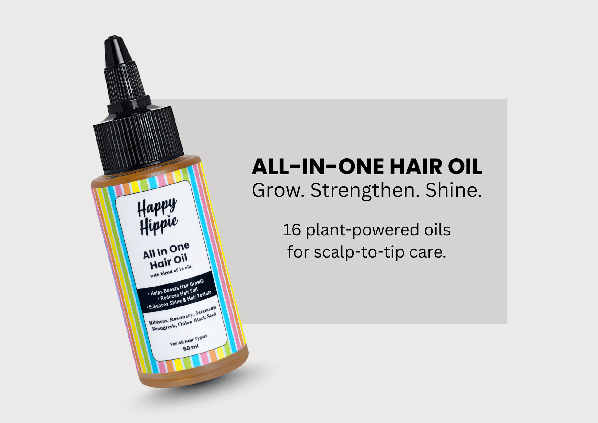 With regular use, you will notice stronger roots, reduced hair fall, and visibly healthier strands. That’s why so many customers shop Happy Hippie’s all in one hair oil as their trusted everyday product.