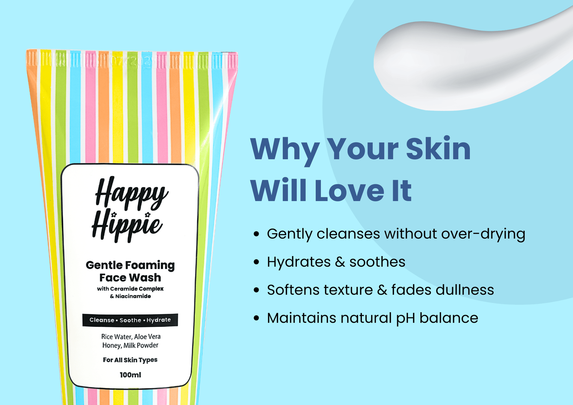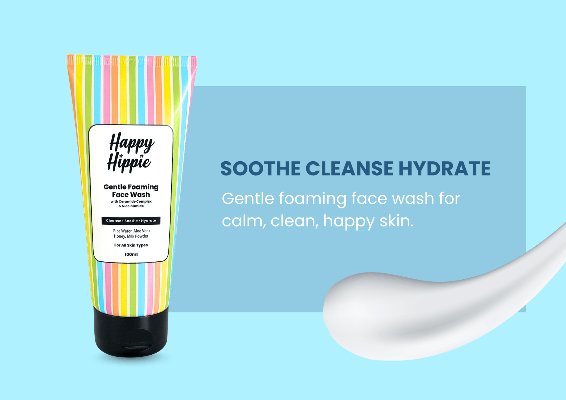 At Happy Hippie, we believe skincare should feel good and actually work. Our Gentle Foaming Face Wash is crafted with a skin-loving blend of nourishing ingredients to bring your skin the perfect balance of calm and clean.